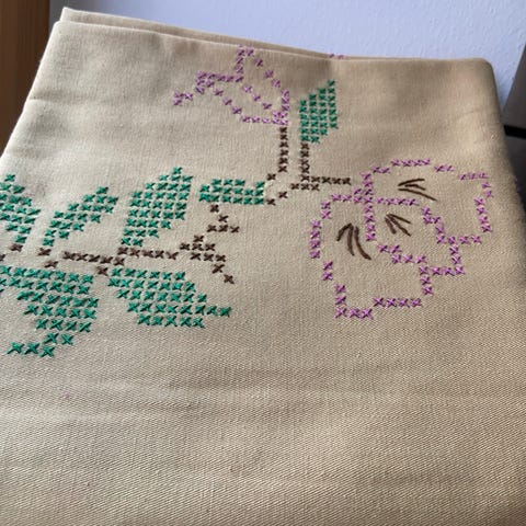 Babyrosa bomuldsdug med hvide frihånds- og korsstingsbroderede blade og grene.