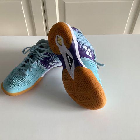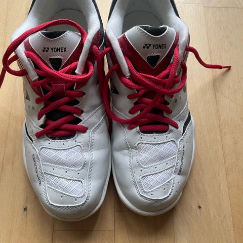 Træningssko / badmintonsko i hvidt skind. Desuden hvid og gul dekoration og gule snørebånd. Sålerne er af gummi der ikke smitter af. Indersål mangler.
