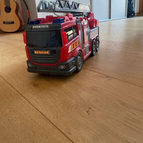 Fin rød brandbil 25 cm med stige og sprøjte. Beholder til vand.