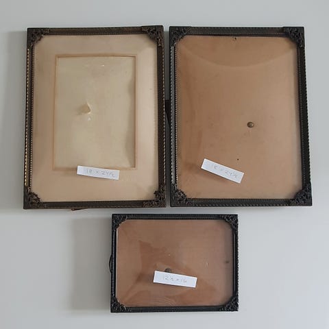 Det største med buet glas (billed 3 og 4) måler 16 * 21 cm. Pris 120,-kr.