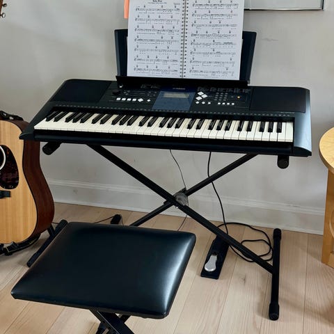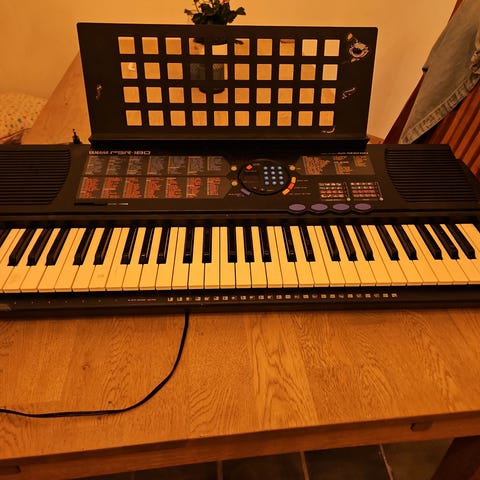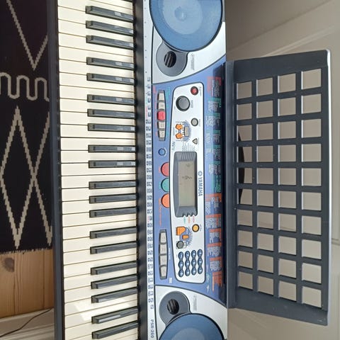 Yamaha keyboard med flere funktioner, herunder forskellige knapper og indstillinger til musikproduktion. Instrumentet har et display og flere kontrolknapper til justering af lyd og rytmer.