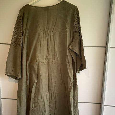 Flot grøn skjortekjole i lækker linned kvalitet fra Gozzip. Gennem knappet og med lommer. Stof: linned og viskose. Farven er som på billedet, hvor du ser hele kjolen. Størrelse M i mærket = 46-48.