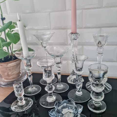 Venstre lysestage (billede 1), designet af Bengt Edelfalk for svenske Skruf Glasværk i 60/70-erne. Diameter 9 cm, højde 8 cm.