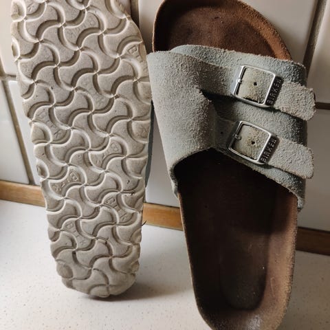 Super flotte sandaler fra BIRKENSTOCK, white leather med regulerbare remme ved forfod samt ankel. model, dame, str 38, narrow size, indvendig sål mål 24,5 cm . Brugt få gange, rigtig fine uden slid. Fine såler. Nypris kr. 900,-