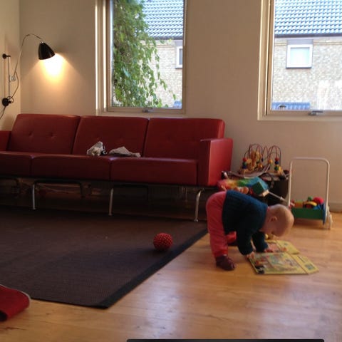 Armlænene er monteret efter af sofaen var købt og man kan se en farveforskel. Sofaen har patina, men fremstår pæn.