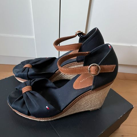 Tommy Hilfiger sandal med skind remme str 41, sælges, de var købt som brudesko, men da jeg kom til skade med foden, kunne jeg ikke passe dem, og blev derfor ikke brugt. Nypris 900kr, sælges for 500kr