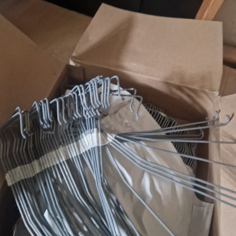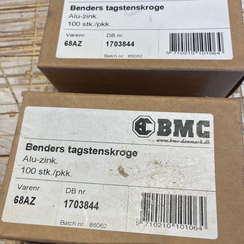 Tagtegls kroge, Gunnebo, b: 3,5 l: 6, 2 æsker ca. 200 stk. galvaniserede teglkroge, tykkelse 2,8 m/m, samt 36 stk. store galv. søm, samlet pris, kan sendes.