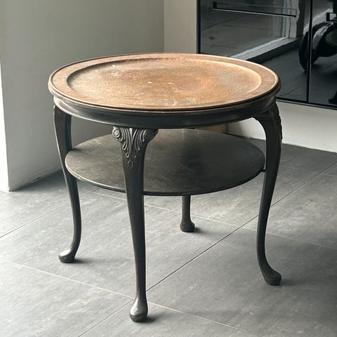 Bordet er med indbygget skab i soklen. Bordet er i egetræ, bortset fra bordpladen som er egefinér. Dugen på billedet kan medfølge.