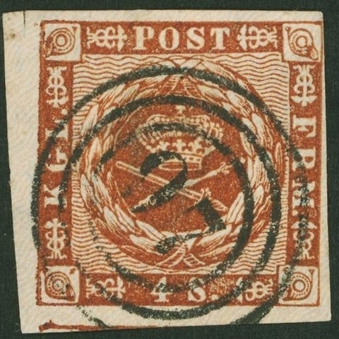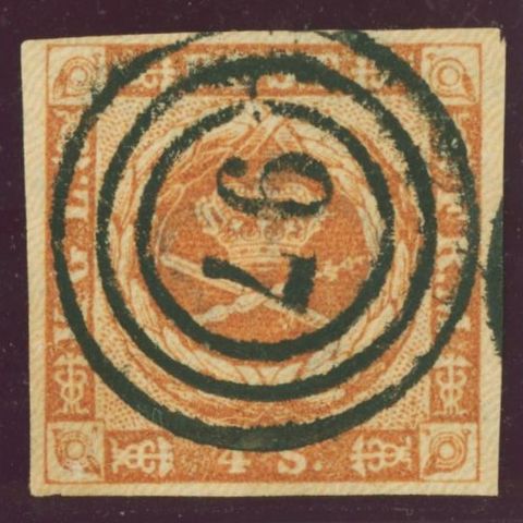 4 skilling brun 1858, AFA nr. 7. Pænt fuldrandet og fejlfrit mærke annulleret med nummerstempel 77: Viborg. Bagpå rester af original gummiering.