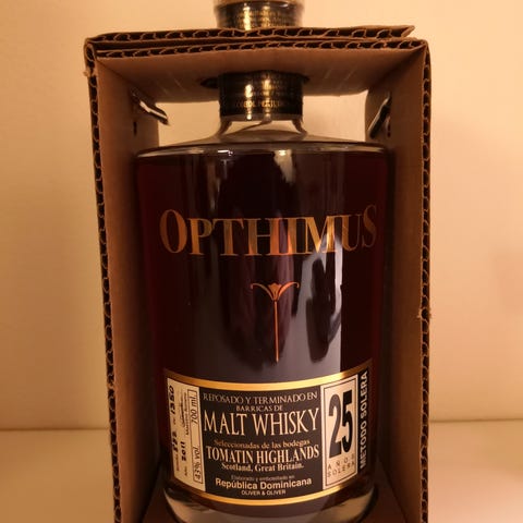 Opthimus fra Tomatin Whisky fade. Rommen har lagret 25 år i ex-bourbon fade og er derefter modnet på en brugt single malt fad. Denne meget dybe og mørke kombination af rom og whisky, kan være svær at mestre, men Opthimus har formået at skabe et miks i særklasse. Duften byder et miks af sirup, moden frugt og et hint af den malte whisky. Smagen er kraftig og fed med smagsnuancer af nougat og krydderier.