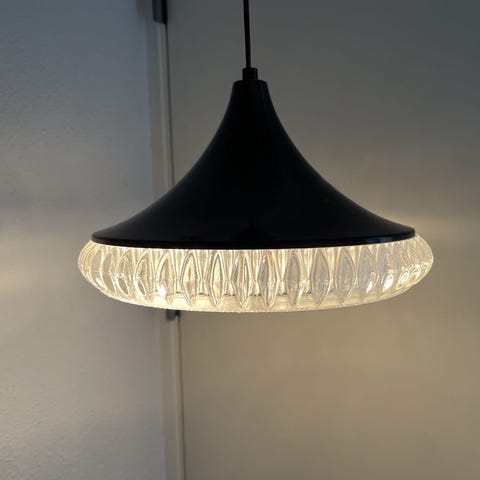 Ældre pendel med trompetformet skærm. Diameter ca 38 cm. Guld/messingfarvet med hvid underside. Der er brugsspor på.
