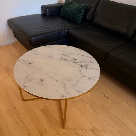 Sofabord med marmorfod og 2 glasplader der kan forskydes fra hinanden, hver glasplade måler 65 X 65 cm, totallængde 130 cm, totalbredde 65 cm, højde på den ene glasplade 44 cm, højde på den anden glasplade 51 cm, bordet er meget velholdt med meget få brugsspor.