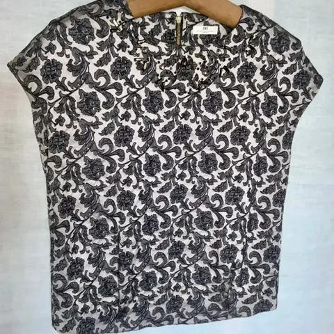 Dame selskabs mønstret bluse i mørk udgave med lyst foer samt sommer vest i mønster.