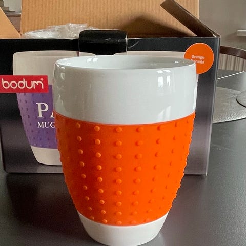 Bodum "Pavina" termokrus i porcelæn med turkis silikonegreb. Smart silikonegreb, så man ikke brænder fingrene på kruset.