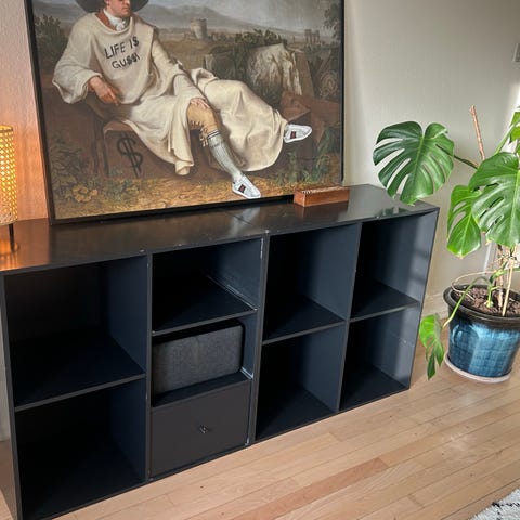 4 smukke lilla atbo reoler med top-plade sælges. Målene er uden topplade. Hvert element har målene H=B=70cm, D=30cm. Nogle af kasserne har store huller skåret i bagepladen som vist på billedet.