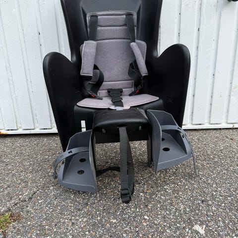 Godt brugt barnestol med beslag til montering på bagagebæreren af en cykel