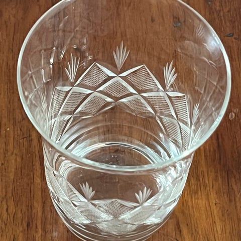 Glas. Ikke helt sikker, men designet er Ulla eller Wien Antik. Med mønster. Glassene er håndslebne.