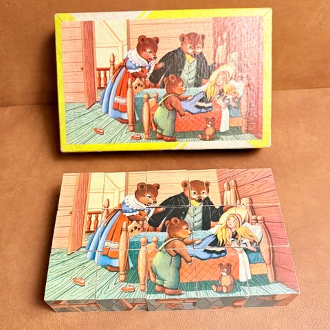 Billed kuber med motiver fra Goldilocks and the Three Bears. Lavet i Kina.