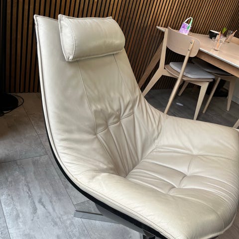 Lænestol, tekstillæder, Skippers møbler, Velbrugt lænestol med fodskammel. Meget behagelig at sidde i, men lugter desværre af cigaretter, og kan derfor ikke være hos os. Læderet på stolen er falmet og matcher ikke helt farven på fodskamlen. Der er også nogle rifter på bagsiden - se billeder. Ikke sikker på, om det er læder eller imiteret læder, men bagsiden er garanteret imiteret læder. Perfekt komfortstol til dig, der ikke er generet af lugten af gammel røg.