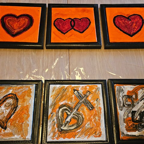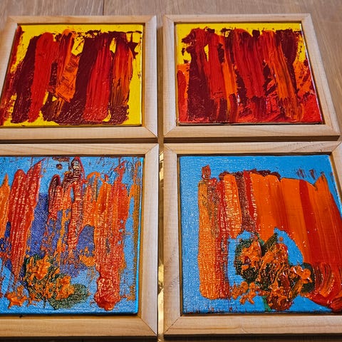 2 stk malerier på lærred inkl. rammer, lærred uden ramme 30x30 inkl. ramme 34x34