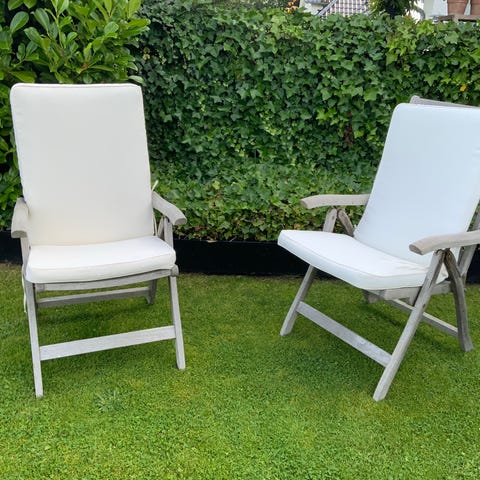2 stk. Pæne hvide positions havestole med 4 helt nye kvalitets hynder (2 nye xtra hynder kan tilkøbes billigt hvis du ønsker 6 stk.)