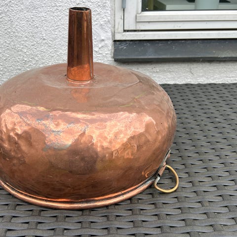 Konstruktionen i kobber vidner om solidt håndværk og industriel funktionalitet, og tragten fremstår i meget flot stand med smuk patina og intakt form. Den er både dekorativ og historisk interessant – ideel for samlere af militærudstyr, antik værktøj eller som et rustikt og karakterfuldt interiørelement.