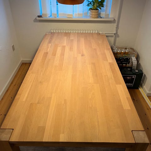 Massivt Egetræs spisebord. Der er umiddelbart plads til 8 personer, men med de medfølgende bordplader, bliver der plads til 12 personer. Bordet er i en fin stand i en lækker udførelse.