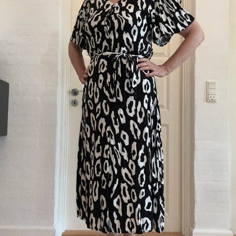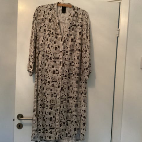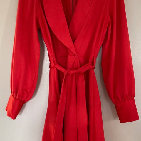 Rød, lang kjole med fint mønster, bindebånd, knapper hele vejen ned (som dog er syet sammen). Let og dejlig at have på, 100% viskose.