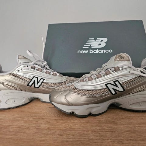 Kun brugt to gange fremstår som nye. New balance sko i ruskind og med newbalance logoet i guld.