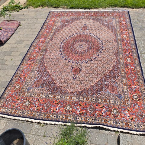 Ægte Persisk håndknyttet Moud tæppe, 194 × 296, uld på bomuld, nyrenset og som nyt. Flotte jordfarver med blå, rød, orange, lyserød og grøn farver, dejlig blød uld