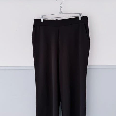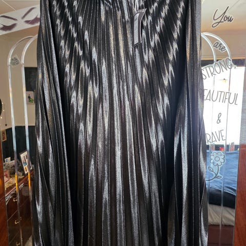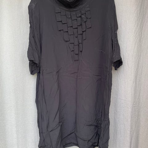 Lynlås bagpå, syet i baner, strech i stoffet. Længde: 62 cm.