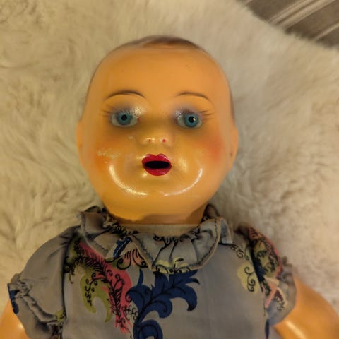 Charmerende håndsyet løg dukke fra omkring 1930'erne påsat papplade. Har alders relateret brugsspor og er noget vakkelvoren, tøjet er noget nusset og blomsterbuketten noget vissen.