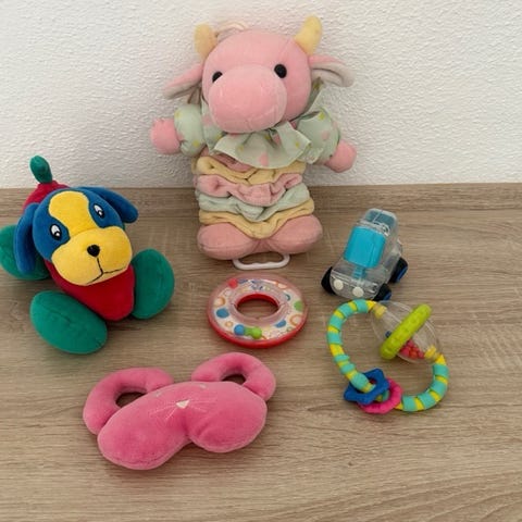Babylegetøj sælges. Bamsen og elefanten kan muligvis spille, hvis de får nye batterier, men jeg har ikke testet det. Derudover 5 bløde bolde, 3 biler, 2 Thomas tog, Gonge motorikringe til gulv eller balance f.eks. på hovedet eller armene. En bilnøgle og et sanselegetøj. Alt dette sælges samlet for 200 kr. Jeg handler gerne MobilePay. Jeg sender gerne, hvis køber betaler for porto.