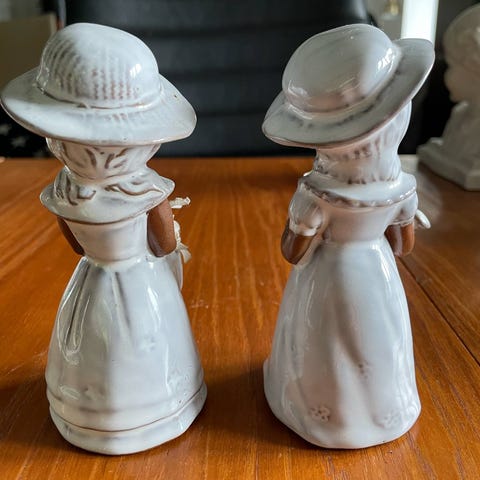 3 træfigurer klædt i sommerkjoler og hatte. Meget dekorative. De er gamle men hele og fine. Dog er den ene lidt falmet på kjolens ryg fordi den har stået i solen engang. 🌞 Se sidste billede. - Vintage fra Søstrene Grene.