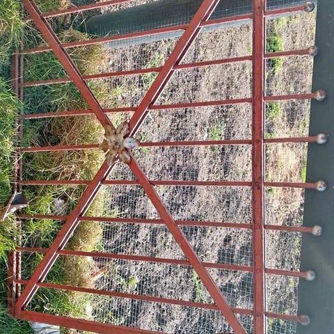 Sort smedejernslåge 200 cm høj og 121 cm bred. Hertil skydelås, 2x beslag og ophæng. Fremstår I fin stand med få rust mærker.