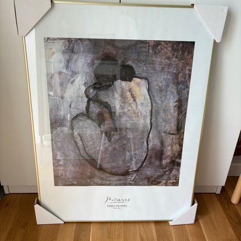 Picasso Les Deux Frères maleri med motiv af to børn, et i baggrunden og et i forgrunden. Maleriet har en varm farvepalette med jordfarver og en gylden ramme.