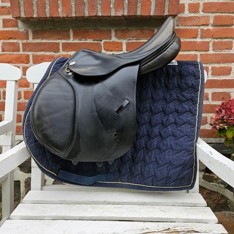Brugt meget lidt, så sadlen fremstår næsten som ny. Alt oprindeligt fyld er omstoppet med kvalitets uld fyld, efter sadelmagerens anbefaling, da fabriksfyldet var meget hårdt. Der er kun skridtet en gang i den nye stopning, så den kan sætte sig efter jeres pony.