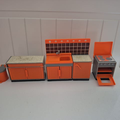 Komfuret er Lundby, det kommer fra et helt komfur væg modul. Derfor er der lim på side & bund.