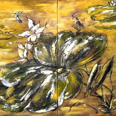 Maleriet forener bæredygtighed og skønhed i en harmonisk fortælling om transformation og kreativitet.
