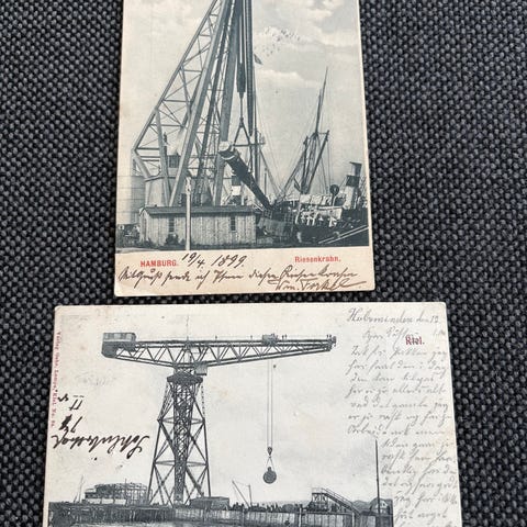 Postkort med kæmpekran under arbejdet på havnen i Hamborg.