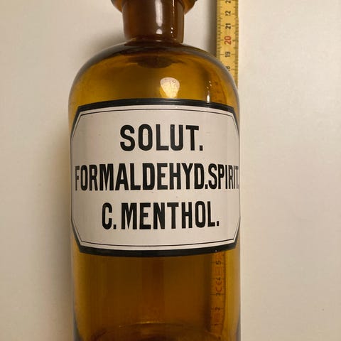 Etiketten er delvist intakt og giver et sjældent indblik i datidens farmaceutiske emballage og advarselspraksis, hvor fenol – også kendt som karbolsyre – blev anvendt som desinfektionsmiddel, men var stærkt giftigt ved indtagelse. Flasken har sandsynligvis været opbevaret i et svensk apotek og er et autentisk eksempel på medicinhistorie fra mellemkrigstiden.