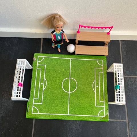 Fodbold med en barbiedukke, to hunde, en bane og tilbehør. Sælges samlet.