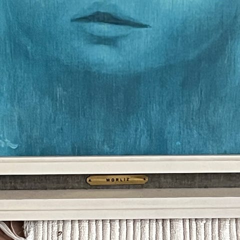 Maleriet indrammes elegant i en diskret metalramme, der fremhæver værkets moderne æstetik uden at stjæle fokus.
