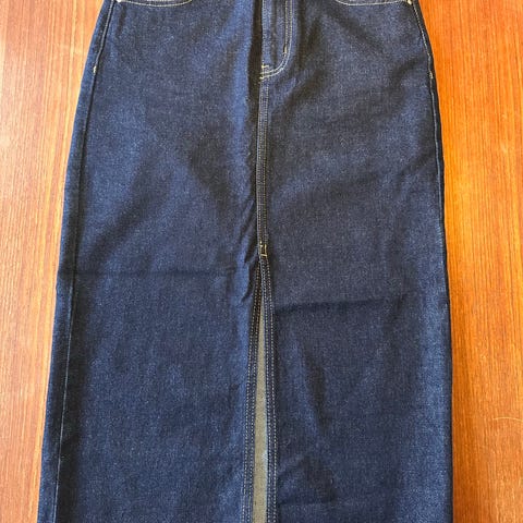 Lårkort denim nederdel med slid. Måler ca 33,5 cm.