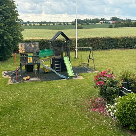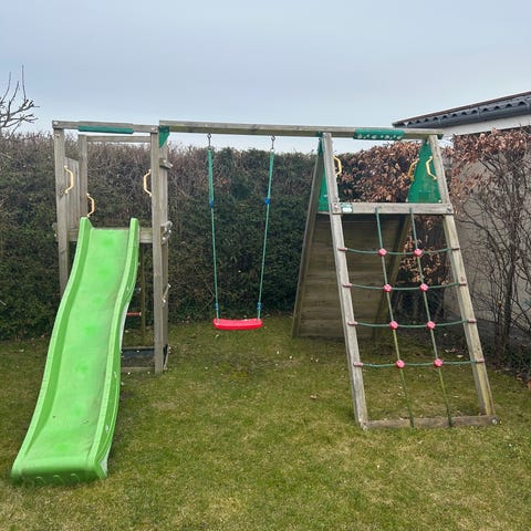 Jungle gym shelter legestativ med 2 gynger, en alm. og en baby gynge, en grøn rutchebane samt klatre modul, der er sandkasse i bunden. Brugt meget lidt , købt i maj 2023 kvittering haves..