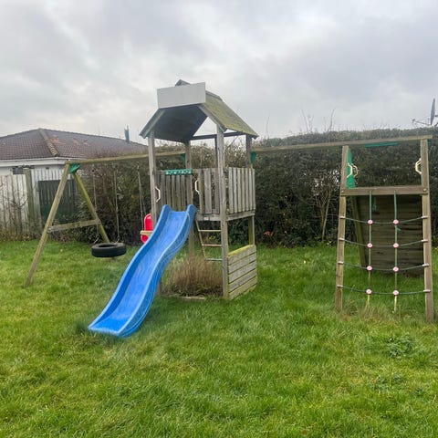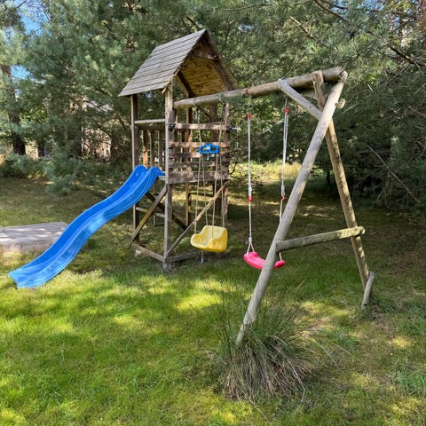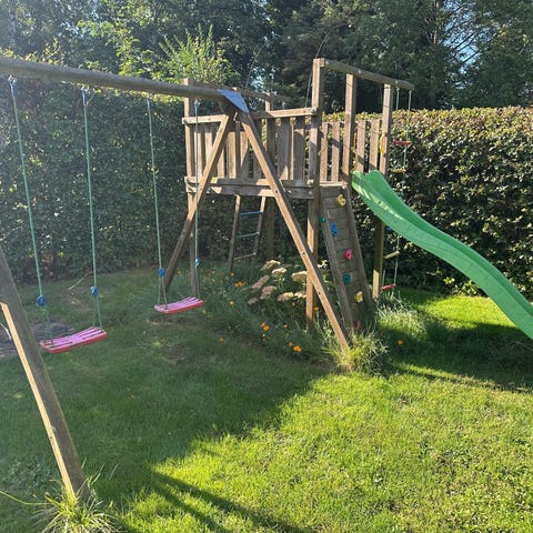 Jungle gym legestativ med 2 gynger, en alm. og en baby gynge, en grøn rutchebane samt klatre modul, der er sandkasse i bunden. Brugt meget lidt , købt i maj 2023 kvittering haves..
