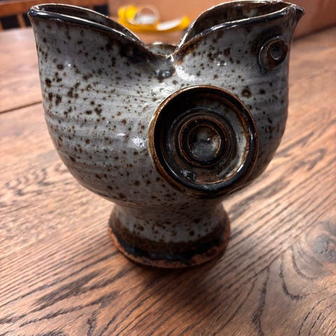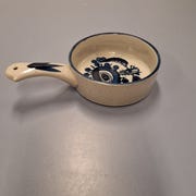 Smuk stentøjskande med hank og klassisk blå dekoration på beige, prikket baggrund. Sandsynligvis fra Tyskland – perfekt som dekoration i et rustikt køkken, bar eller sommerhus.