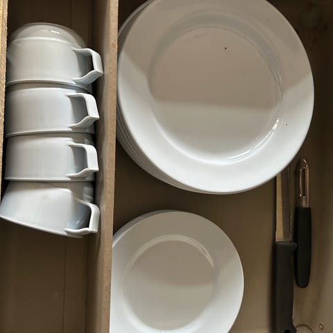 Bowlen indeholder det, der vises på billederne, dvs.3 størrelser gule tallerkener, 6 af hver, 5 knive, 5 gafler og 6 spiseskeer