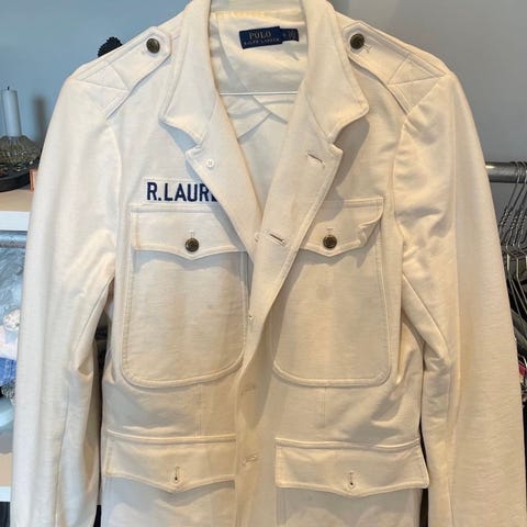 Ralph Lauren jakke str M. Kan snøres ind i livet. Hætten mangler. Har dog ingen betydning for brug af jakken. Er rep øverst bag på jakken. Ses på sidste billede