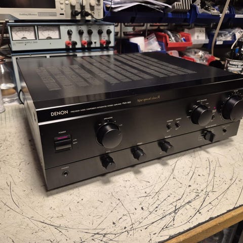Solid forstærker fra Denon på 2x80 watt i 8 ohm.